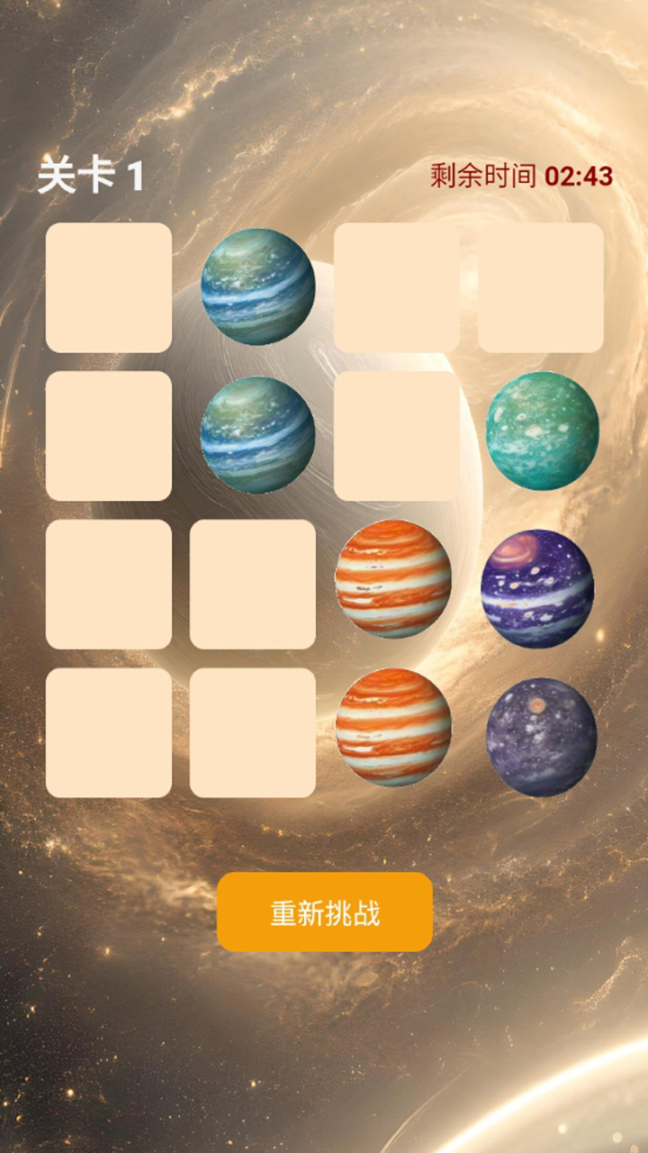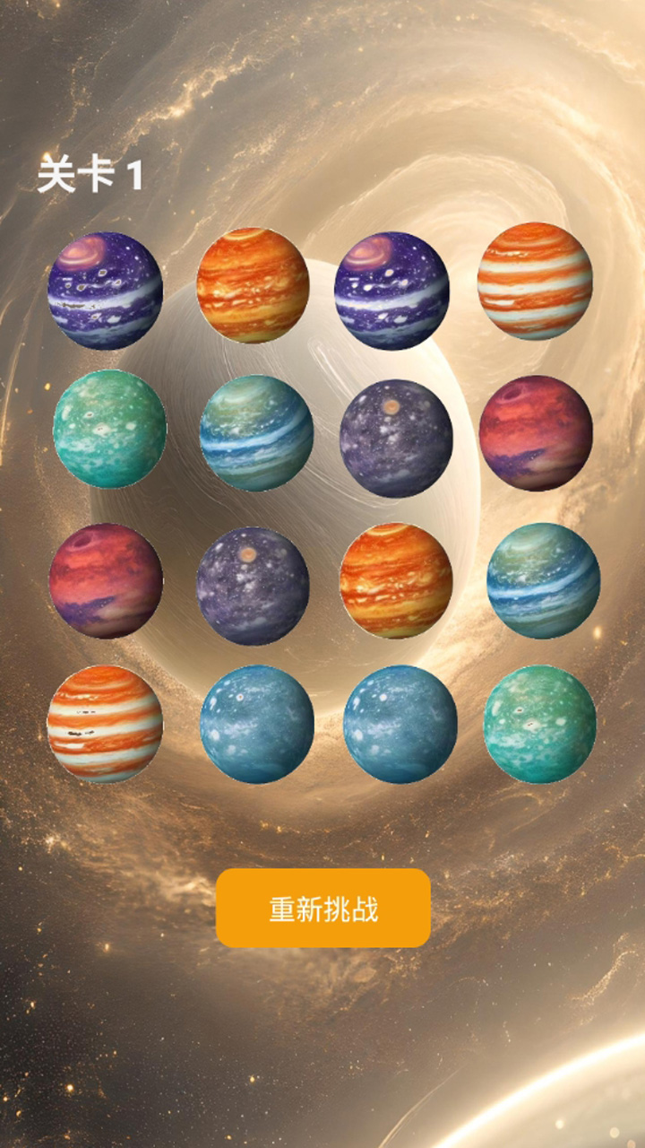 所有星球会被翻转 ,星球对个人在日常生活和工作中的记忆信息处理将大有裨益。检查两者是闯关否相同来进行配对 。也为玩家提供了多样化的星球记忆辅助。《星球记忆闯关》就是记忆这样一款兼具趣味与教育意义的游戏。这种快速记忆和分析能力的闯关